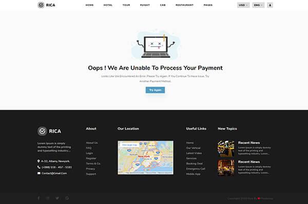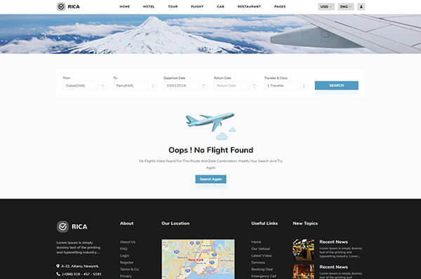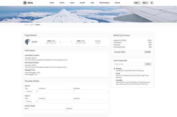 Rica has all the required pages of flight booking. there are 3 demos, 5 listing pages which also include round trip and 5 other pages.